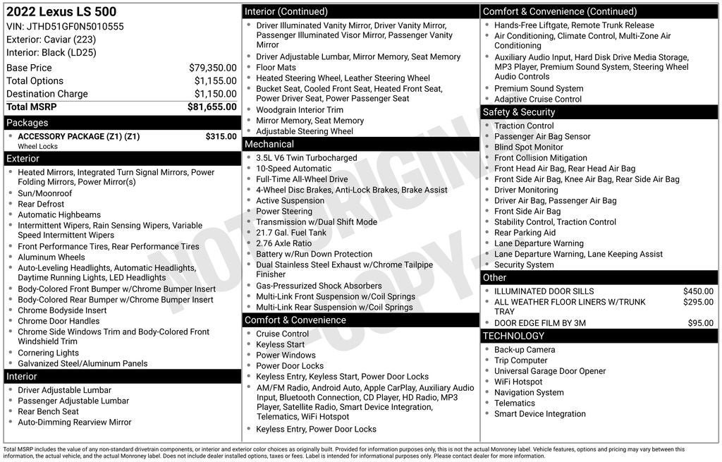 Caviar 500 Base AWD 10-Speed Automatic 3.5L V6 DOHC 24V Sunroof / Moonroof, Back Up Camera, Bluetooth®, Clean History Report, a Clean, One Owner Carfax, AWD, Black w/Leather Seat Trim, 12 Speakers, 4-Wheel Disc Brakes, ABS brakes, Adaptive suspension, AM/FM radio: SiriusXM, Apple CarPlay/Android Auto, Auto High-beam Headlights, Automatic temperature control, Brake assist, CD player, Dual front impact airbags, Dual front side impact airbags, Electronic Stability Control, Emergency communication system: Enform Safety Connect (complimentary 3-year subscription), Exterior Parking Camera Rear, Four wheel independent suspension, Front anti-roll bar, Front dual zone A/C, Fully automatic headlights, Head restraints memory, Headlight cleaning, Heated & Ventilated Front Bucket Seats, Heated door mirrors, Heated steering wheel, Knee airbag, Lexus Premium Audio System, Low tire pressure warning, Memory seat, Navigation System, Navigation System w/12.3 Touchscreen, Occupant sensing airbag, Overhead airbag, Passenger door bin, Power adjustable front head restraints, Power door mirrors, Rain sensing wipers, Rear anti-roll bar, Rear side impact airbag, Rear Window Blind, Rear window defroster, Remote keyless entry, Security system, Speed control, Speed-Sensitive Wipers, Steering wheel memory, Steering wheel mounted audio controls, Telescoping steering wheel, Tilt steering wheel, Traction control, Variably intermittent wipers, Wheels: 19 Split 10-Spoke Alloy.