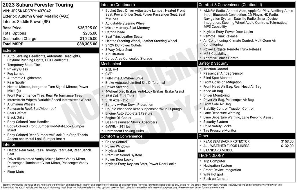 Autumn Green Metallic Touring AWD Lineartronic CVT 2.5L 4-Cylinder DOHC 16V Navigation, Sunroof / Moonroof, Back Up Camera, Bluetooth®, Clean History Report, Leather Seat Trim, Navigation/Nav/GPS, Alloy Wheels, Audio Controls on the Steering Wheel, Blind Zone Monitoring, Cruise Control, Dual Climate Control, Power Liftgate, Power Sunroof, Premium Heated Leather Seats, Proximity Keyless Entry, Push Button Start, Rear View Camera, Satellite Radio, Side Air Bags, a Clean, One Owner Carfax, 9 Speakers, Anti-whiplash front head restraints, Auto High-beam Headlights, Automatic temperature control, Brake assist, CD player, Dual front side impact airbags, Emergency communication system: STARLINK Safety and Security (Subscription Required), Exterior Parking Camera Rear, Four wheel independent suspension, Front anti-roll bar, Front dual zone A/C, Fully automatic headlights, harman/kardon® Speakers, Heated Front Bucket Seats, Heated front seats, Heated rear seats, Heated steering wheel, HVAC memory, Low tire pressure warning, Memory seat, Occupant sensing airbag, Perforated Leather-Trimmed Upholstery, Power driver seat, Power Liftgate, Power moonroof: Panoramic, Power passenger seat, Power windows, Premium audio system: harman/kardon, Radio data system, Speed-sensing steering, Split folding rear seat, Turn signal indicator mirrors.