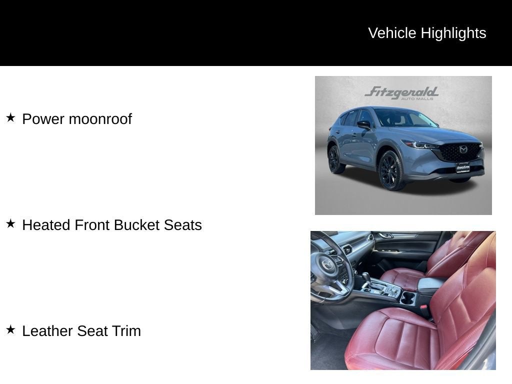 2024 Polymetal Gray Metallic Mazda CX-5 6-Speed Automatic Heated Front Bucket Seats, Leather Seat Trim, Power moonroof. SKYACTIV®-G 2.5L 4-Cylinder DOHC 16V 2.5 S Carbon Edition You will love our NO HAGGLE, NO HASSLE PRICING here at Fitzgerald Auto Mall. Ask us about our BUYER PROTECTION PLAN, LOANER CAR PROGRAMS, AND FREE Vehicle History Report. Can not find what you want?? NO PROBLEM! We have over 1,000 Pre-Owned vehicles available at WWW.FITZMALL.COM. You can also visit us in person at 114 Baughmans Lane Frederick MD, 21702 or Call Us @240-629-7301.